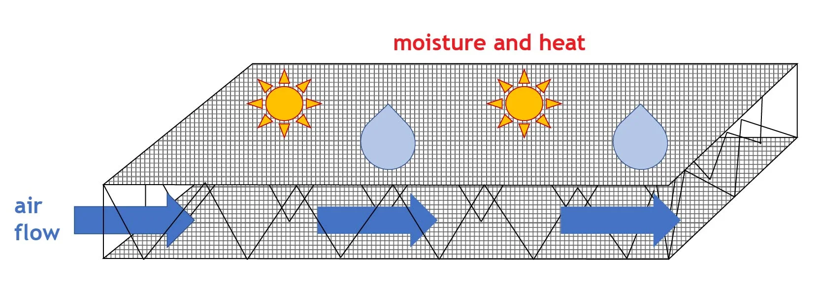 Spacer layers are knit with polyester/rayon/spandex blended yarn and bound together with microfilament yarn. The space between layers creates a micro-climate, used for cooling. As heat and vapor leave the body, they enter the micro-climate, meet cooler air, and ventilation occurs.